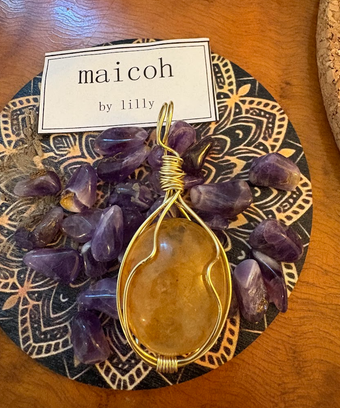 Bär unika handgjorda smycken gjorda med ädelstenar och kristaller.